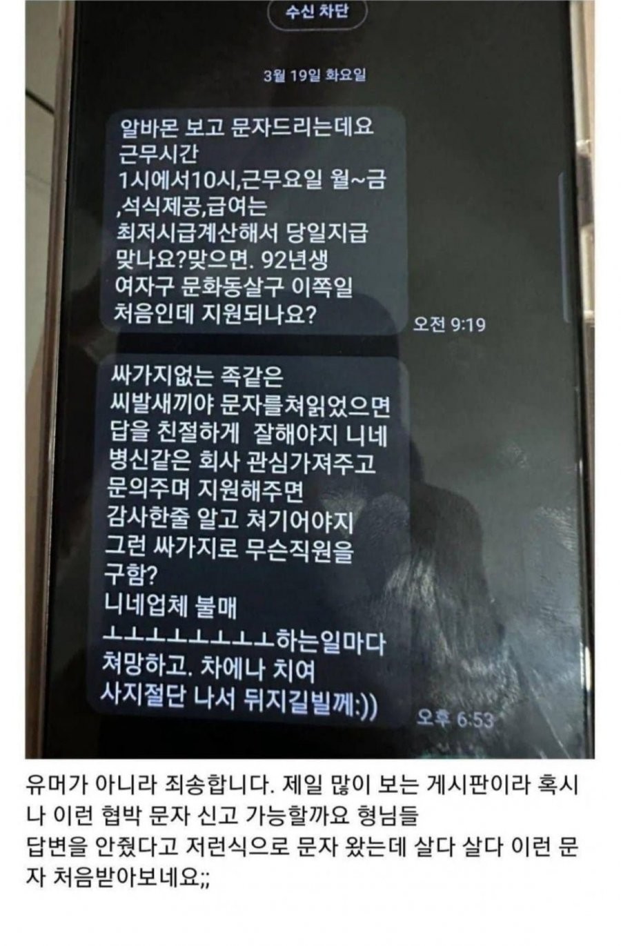 알바 구하다 개빡친 92년생 알바녀 최고관리자 2025-10-04 05:01 30 0 이전글 다음글 목록 본문 살다살다 이런 문자 처음 받아서 당황했다고... 댓글목록0 등록된 댓글이 없습니다.