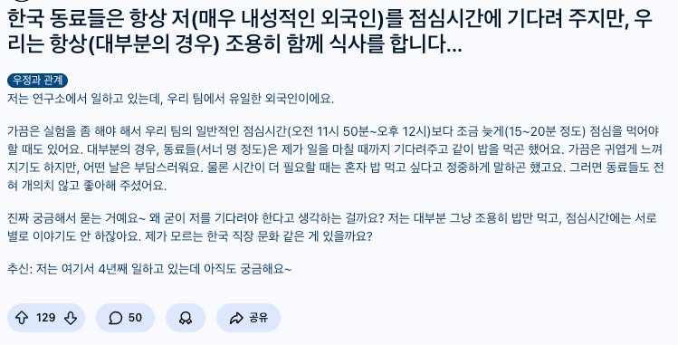 점심시간에 같이 밥먹기를 기다리는 한국동료들이 부담스러운 외국인
