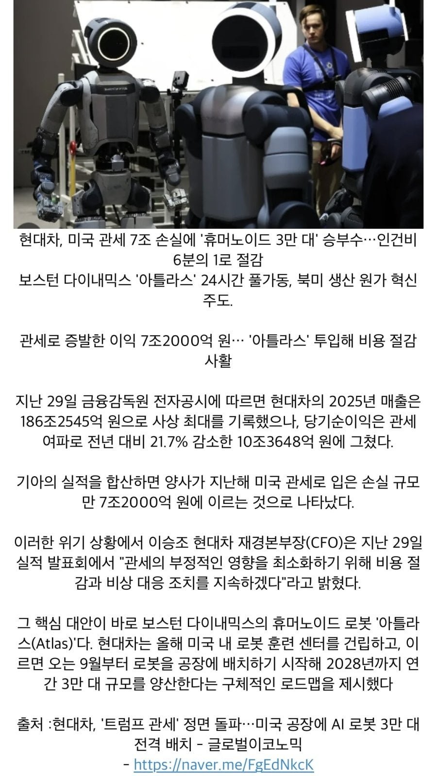 최근 현대차 미국 공장 근황 최고관리자 2026-02-06 09:01 23 0 이전글 다음글 목록 본문 현대차, '트럼프 관세' 정면 돌파…미국 공장에 AI 로봇 3만 대 전격 배치 - 글로벌이코노믹현대자동차그룹이 도널드 트럼프 미국 행정부의 관세 부과에 따른 수익성 악화를 극복하기 위해 2026년부터 미국 내 자동차 생산 공장에 인공지능 기반 휴머노이드 로봇을 대거 투입한다. 지난 3일(현지시각) 니케이 아시아(Nikkei Asia) 보도에 따르면, 현대차는 계열사 보스턴 다이내https://m.g-enews.com/article/Global-Biz/2026/02/202602040635141260c8311272ca_1 ▶사고 막으려다 하반신 마비 ㄷ여기를 눌러 링크를 확인하세요 댓글목록0 등록된 댓글이 없습니다.