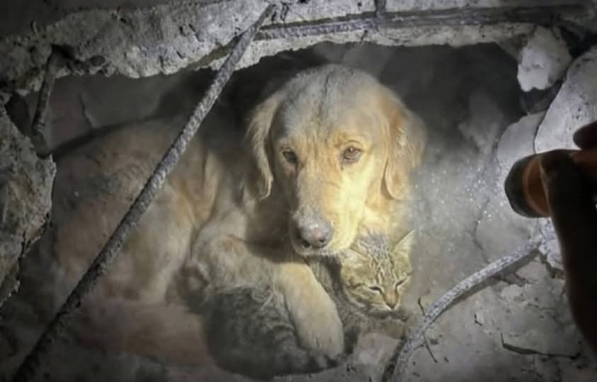 골든 리트리버 한 마리가 지진 잔해 옆에서 이틀 동안 짖으며 다친 고양이를 두고 떠나지 않았습니다.