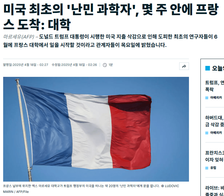 예산 삭감때문에 연구 중단될 위기 과학자들을 위해 엑스 마르세유 대학에서 신설한 "과학을 위한 안전한 장소" 프로그램으로 미국인 과학자들 모집중.