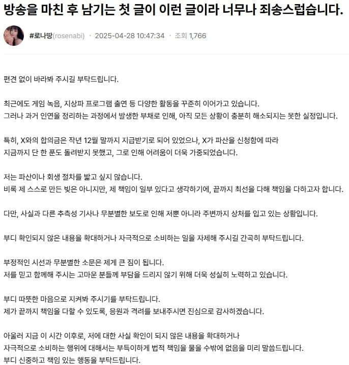 엑셀 방송 후 공지 올린 로나땅 서유리 근황jpg