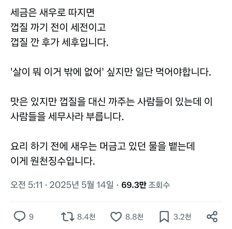 '세금은 새우로 따지면 껍질 까기전이 세전입니다.' 최고관리자 2025-05-15 09:02 28 0 이전글 다음글 목록 본문 왜 다른사람 새우는 타이거새우인데왜 제 새우는 민물새우죠? 댓글목록0 등록된 댓글이 없습니다.