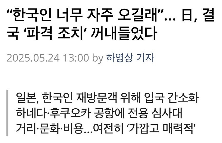 한국이 너무 자주오길래...일본 파격조치 꺼내들다..jpg 최고관리자 2025-05-26 21:01 31 0 이전글 다음글 목록 본문 이랏샤이마세!!! 댓글목록0 등록된 댓글이 없습니다.